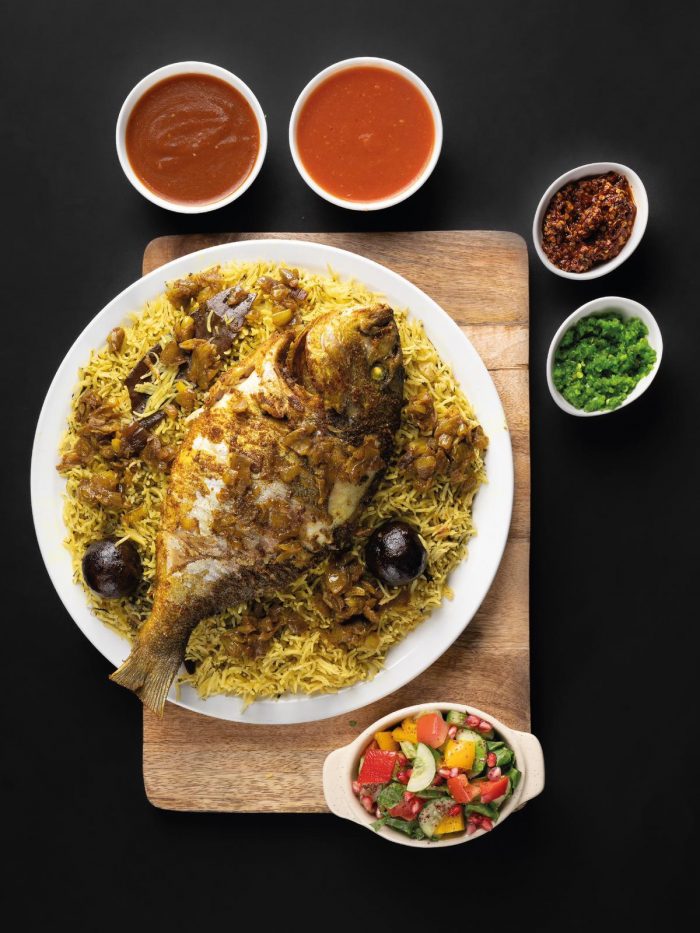 سمكة زبيدي مجهزة ومبهرة بنكهات مطعم زعفران الخاصة مع العيش النثري المطبوخ