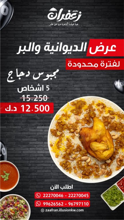 65.00د.كطبخ وتجهيز وتحميش الخروف بنكهات مطعم زعفران الخاصة مع العيش النثري والحشو الكويتي